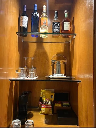 The room came with a Nespresso machine, an ice bucket, various glasses, and coffee pods. The fridge area was replenished daily, along with the fresh fruit basket.