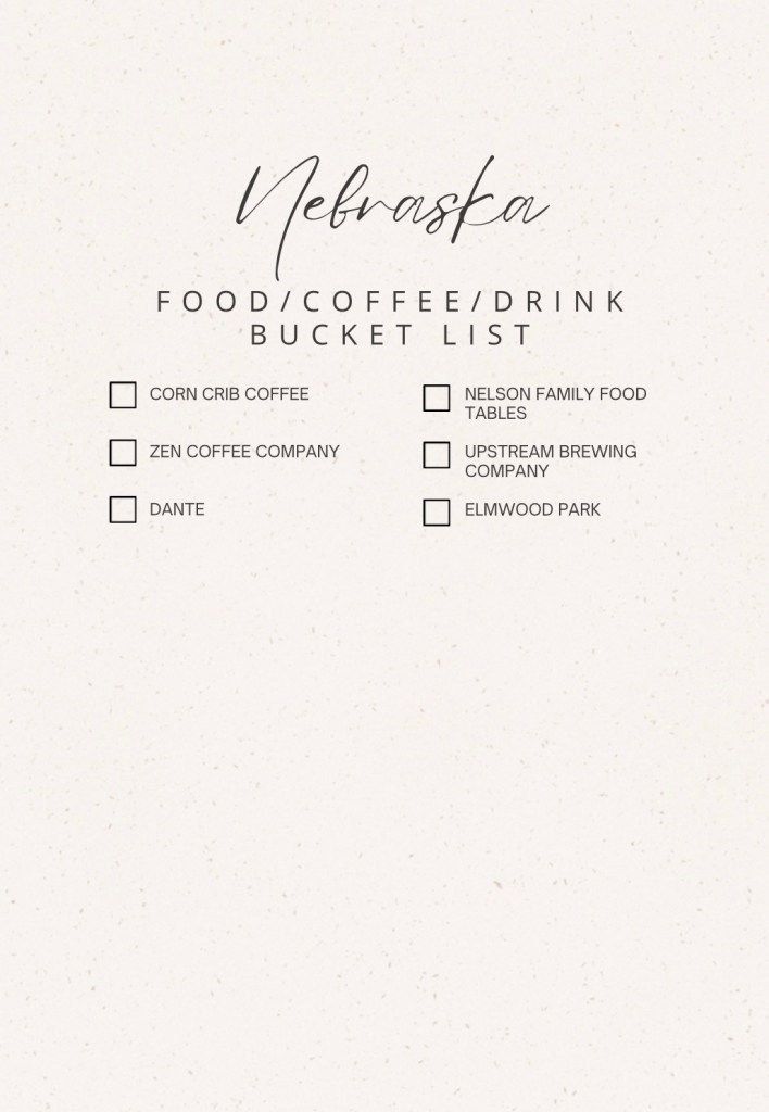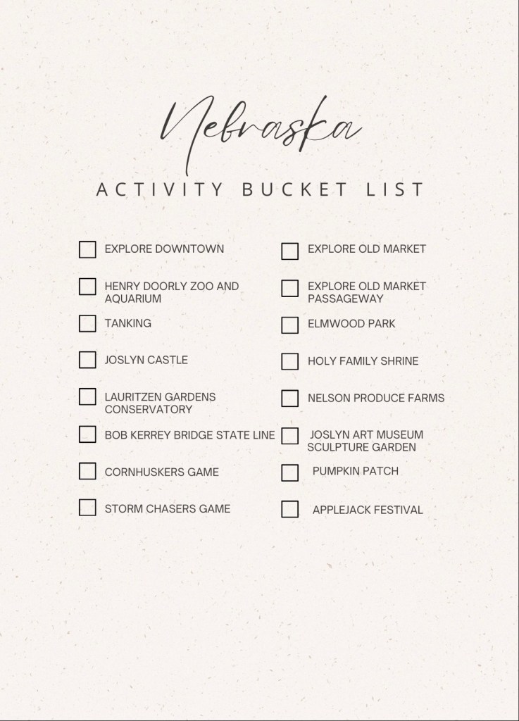 Passports and Preemies, a local Nebraska travel nurse ( She’s a super cool travel nurse that’s currently exploring East Asia. She puts together group trips and works on preventing nurse burnout. She’s a breath of fresh air! I honestly can’t wait to take her recommendations on Omaha and all things Nebraska!) talks about how they recently redid the riverwalk, bringing new life to the old market and downtown area. Check out Kylee’s recs on her Instagram at @passportsandpreemies or her blog at passsportsandpreemies.com. So far, here’s our bucket list for Nebraska! This doesn’t even include day trips to surrounding states! If anyone has any recs, please comment.