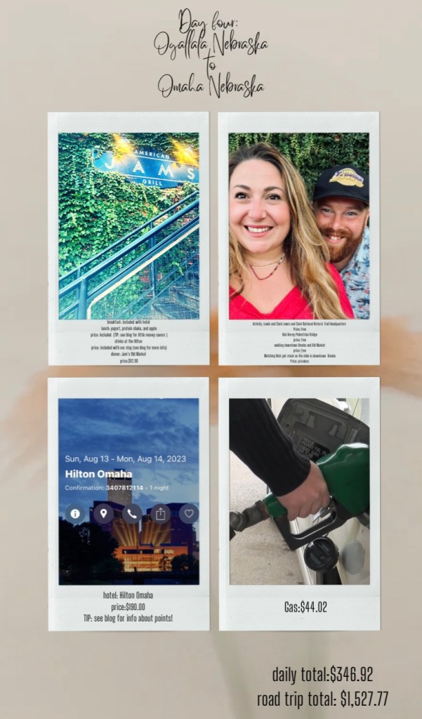 Before we go into traveling long distances on a budget, let’s talk about first impressions of Omaha! We spent the night at the downtown Hilton. Honestly… this was the best service at a Hilton we’ve ever had. Top notch service from the bellman and front desk. I was very impressed with the staff and the hotel. It was in great condition and walkable distance from the downtown area. We have to be careful with our car topper (shout out to roofpax… we wouldn’t be here without ya!) Check out my blog on packing and tips for a cross country road trip for the best topper. We got it from my parents for a wedding shower gift, and we love it! It fits so much. It’s honestly like a game. Now the question is, who do you think is the true packer of the topper is?