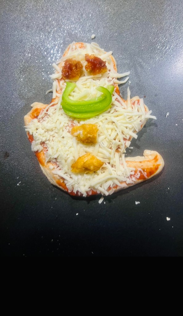 - Start creating your shape of your pizza dough to your desired shape. Examples: ghosts, pumpkins, scary faces, etc. See below for what we did! We did need to use flour to help create the