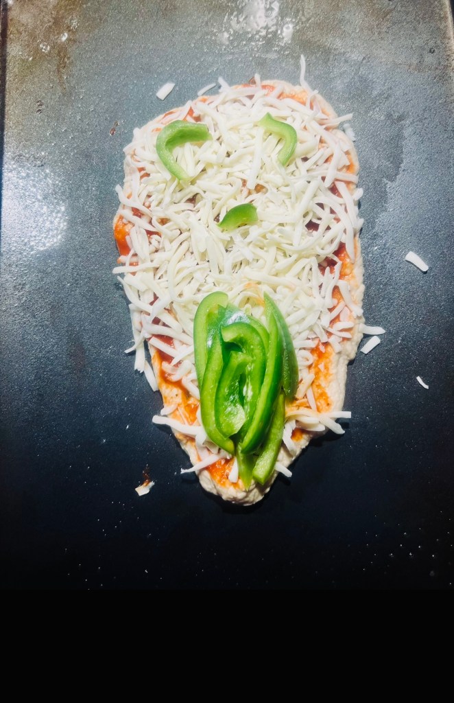 - Put your sauce, cheese, and toppings on the pizza.