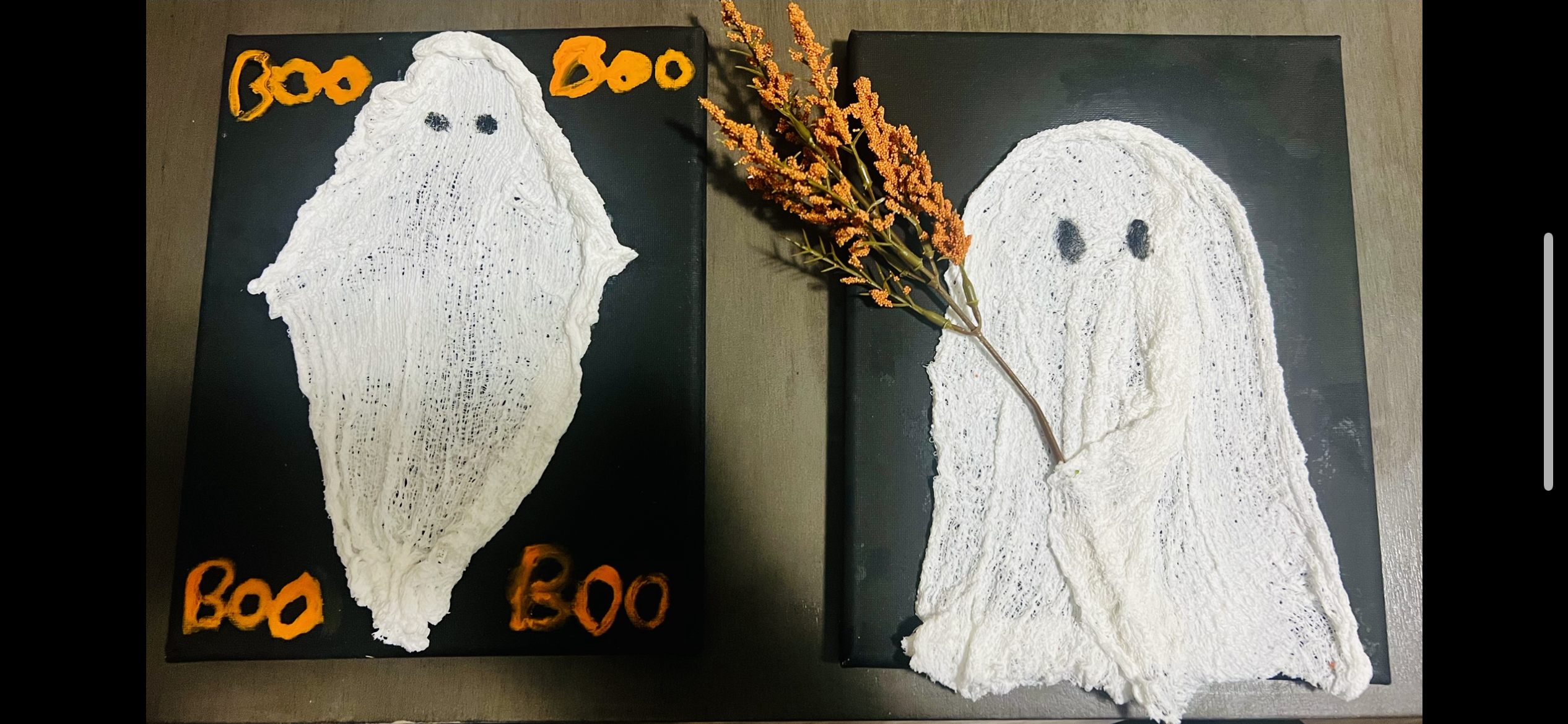 - After the ghost dries, paint eyes, add florals , and other decorations to the canvas with hot glue. You can also add other decor with paint. Get creative!