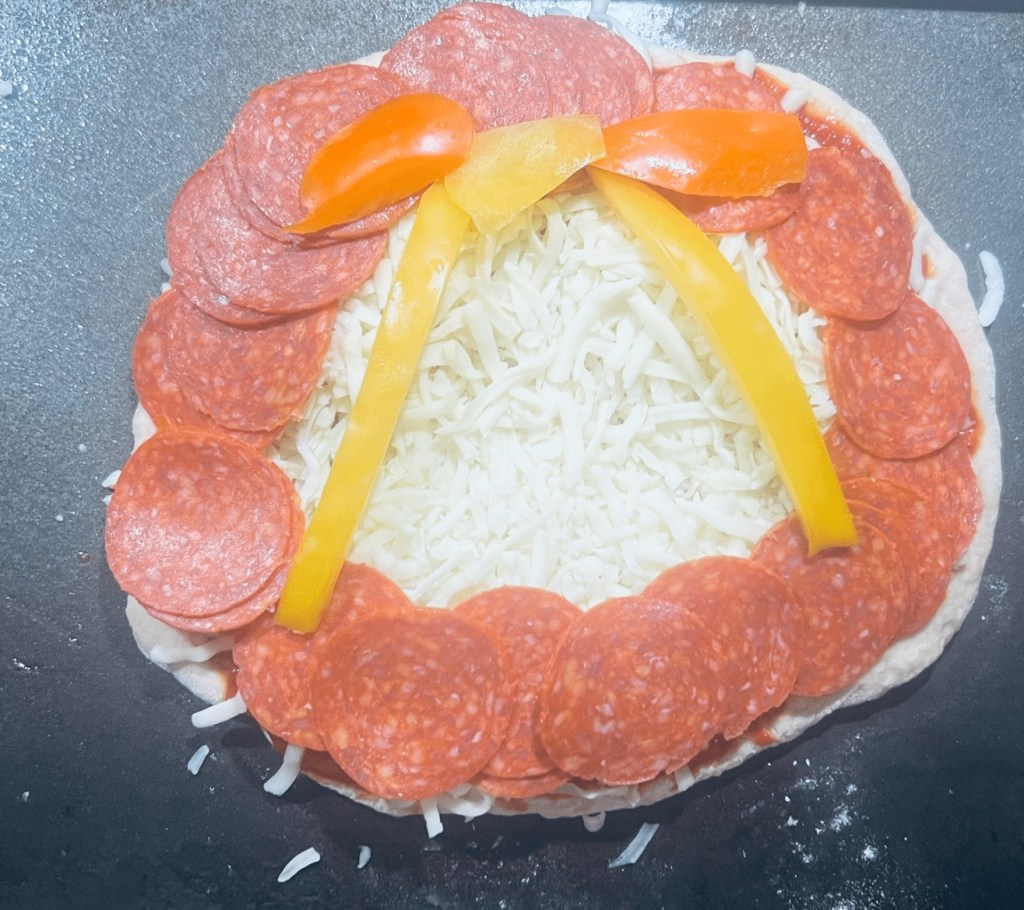 - Decorate the fun holiday shape with sauce, and your favorite pizza toppings.