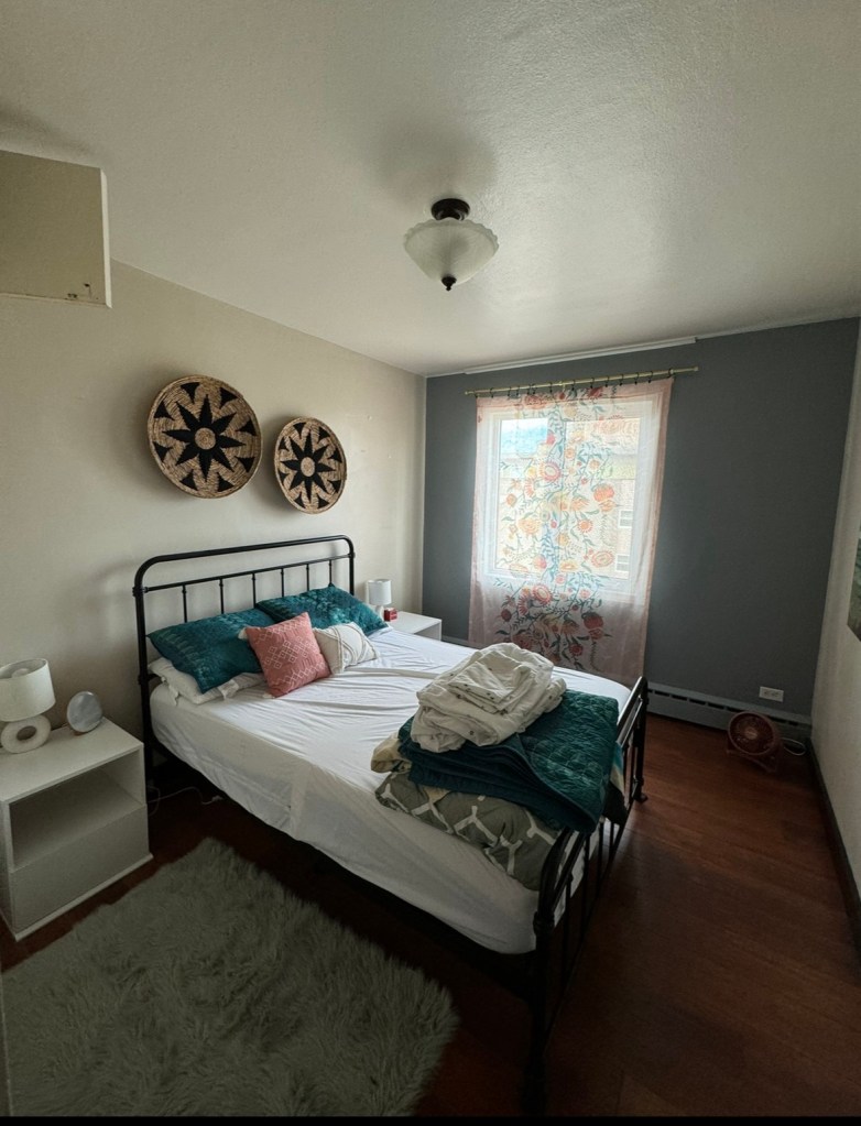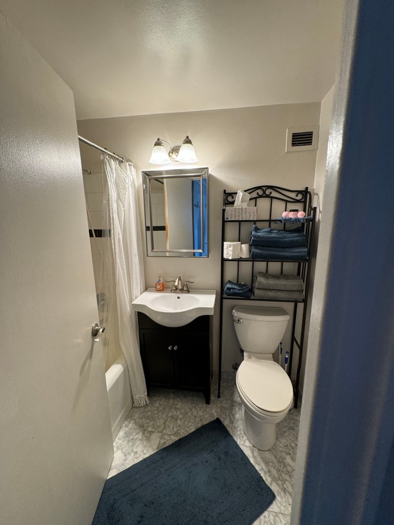 The bedroom was small with a bed, and two nightstands. A large closet was in the bedroom, great for hanging clothes. The room didn’t include a dresser, so we picked up some storage bins at Goodwill, along the way. Again, when we signed this apartment, we knew it was on the smaller side. It’s definitely not the smallest place we’ve stayed in.
