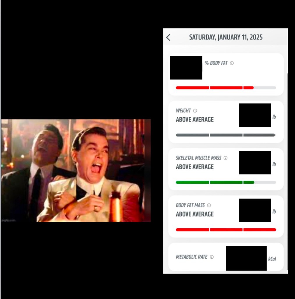 It was a benchmark heavy week because it’s the start of a transformation challenge. With this type of competition, we chose fat loss or increasing skeletal mass. We start the challenge on a body scan that shows your body composition. Check out my body composition from this last week.